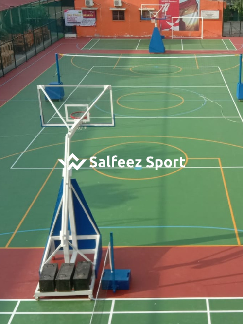 Ring & Tiang Basket → standar FIBA (tinggi 3,05 m, papan 1,8 x 1,05 m).