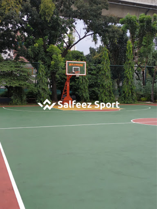 Lantai Lapangan → bisa beton dicat, interlock, vinyl, atau kayu parquet standar FIBA.